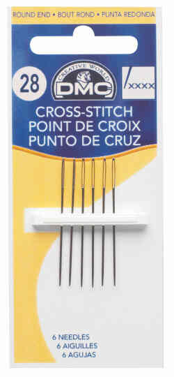 Pack of 3 needles available in size 24 or size 26, these needles have the threading hole in the centre and can, with practice, make your cross stitching quicker - you need a frame so that you can use both your hands to stitch.